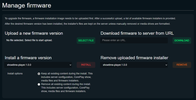 Select Install options to keep or remove existing media, show files and firmware installers.
