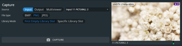Capture a video signal into an image fileProcedure : In Image Library:⚓ProcedureSelect the source to capture.Select the image format for the capture.Select a slot to save the capture.Click to capture the video signal into an image file.Select the source to capture.⚓Select the image format for the capture.⚓Select a slot to save the capture.⚓Click to capture the video signal into an image file.⚓The image is created in the Library and can be loaded into image slots in Images .Option