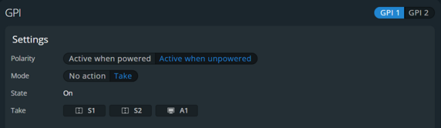Take | In Take mode, select the Screen to take when triggering the GPI |