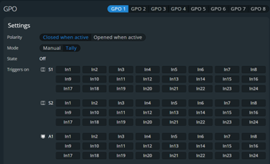 State | In Manual mode, set if the GPO is currently On or Off In Tally mode, check if the GPO is currently On or Off |