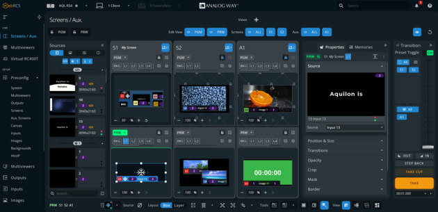 NavigationFor optimal visibility of the Link setup, it is recommended to display the Web RCS on an UltraWide screen (e.g. 2560 x 1440 or 5120 x 1440) and / or adjust the view using a zoom feature of the explorer.Live Screens / Aux. in Link setupIndexScreens displaySources display