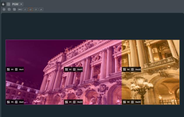 A screen can be composed of outputs of multiple devices. All outputs are treated as of one device and are assigned to one region by default.