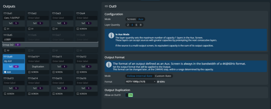 When an output is set to Aux mode with 4 or more layers, the following output(s) are preempted. These outputs become disabled by default, but they can be set to duplicate the content of the preempting Aux output.