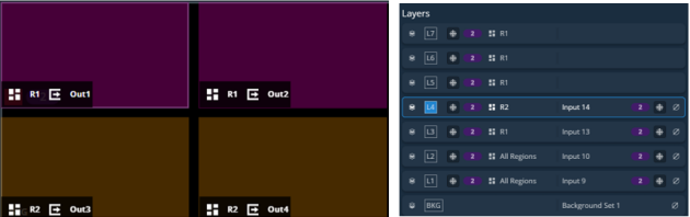 One output can be assigned to only one region and one layer can be assigned to one or more regions.