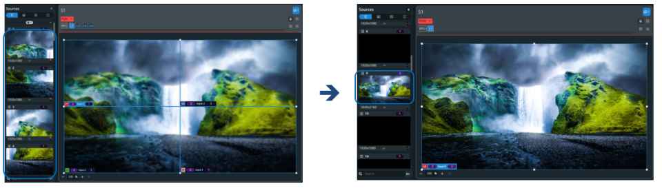 Group four live inputs (in 1x4, 2x2 or 4x1) and use them as one source in one layer.
