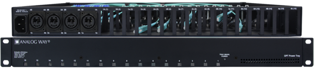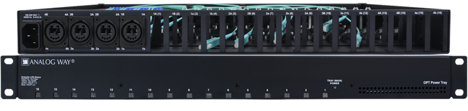 The power tray is a 1RU size housing accessory which can enclose up to 8 or 16 extenders, also providing power source for every installed device. The optical fibers are connected to the Neutrik opticalCON Duo, Neutrik opticalCON Quad, or SC Duplex connectors each carrying signal fibers from the extenders. The HDMI tail cables of the extenders are accessible directly at the back of the power tray.