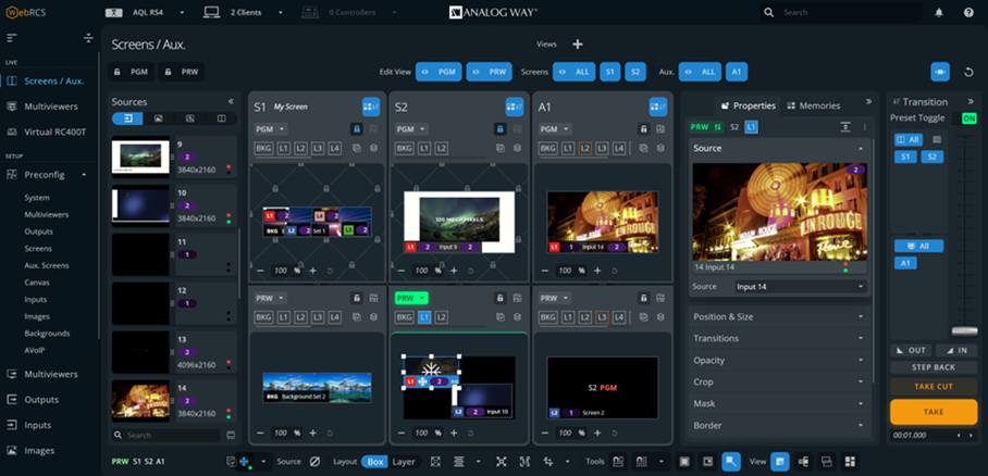 Screens / Aux. is the main page for controlling a show after all pre-configurations are set: