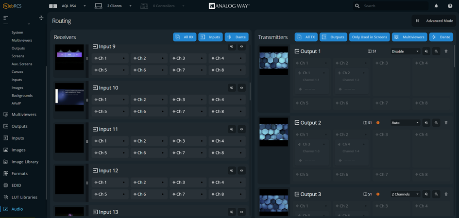 to highlight transmitter channels using this receiver channels.Channel transmitters (Outputs and Dante OUT) audio channels are in the right-side panel: