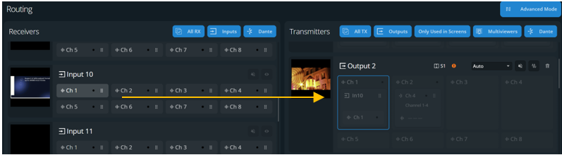 Advanced audio routing assigns one single audio channel of a receiver to one audio channel of a transmitter.