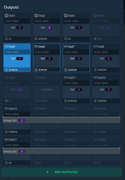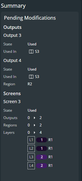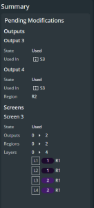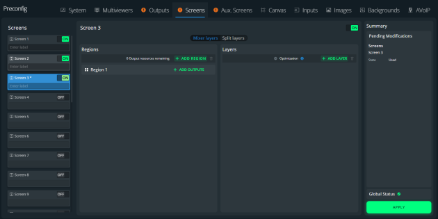 Create a Screen Preconfig > ScreensPrerequisiteAn output group must be set to Screen mode to be assigned in a Screen.ProcedureEnable the Screen and, if needed, enter the label.Select the Layer mode (Mixing layers or Split layers).Click on Add Outputs.OPTIONAL: Add regions.Add LayersClick Apply to save new configuration.Enable the Screen and, if needed, enter the label.⚓Select the Layer mode (Mixing layers or Split layers).⚓Click on Add Outputs.⚓Select the outputs for Region1 (by default) and click on Add Outputs.OPTIONAL: Add regions.⚓Repeat step 3 to assign outputs to this region.Example : To remove outputs⚓Click on .Add Layers⚓and assign them to regions if needed.Example : Layers quantity⚓The number of remaining layers is indicated.It depends on layers capacity and the use of Cut & Fill .For more information about using Cut & Fill, see Cut & Fill effect.Tip : Optimization⚓Hover over optimization for advice on the best layer allocation.For more information see Optimized mode.Extra : ⚓All pending changes are identified with a * and listed in the Summary. If needed, click to cancel pending changes.Click Apply to save new configuration.⚓A new screen is created and can be further adjusted in Canvas.